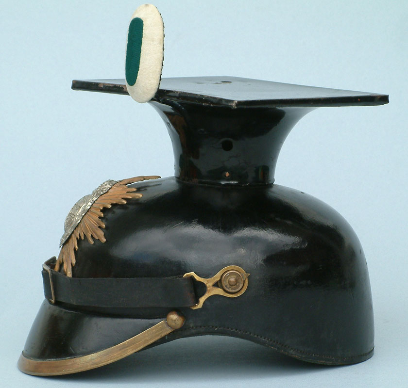 A side view of the Model 1914 Sachsen Tschapka. Note how the back of the helmet is designed so that it curves down around the wearer's skull.