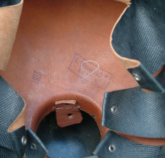 A close up of interior markings. The interior skull is marked size "58", dated 1915 and marked to a Berlin manufacturer A. Wunderlich Berlin.