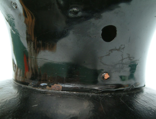 This form of permanently attached metal top was in use from 1914 until it was replaced in mid-1915 by a removable Eisenblech (tin plate) top which utilized a large bayonet-style lug for securing the top to the shell.