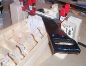 Bringing it Down 10mm A power saw would not work in this case, so I decided that I needed to make a jig, so my hand saw would ride across a hardened steel flat rod. It would destroy my saw, but at this stage, who cares? I clamped the jig onto each station and sawed away. It worked brilliantly and I was able to trim a perfect 10mm off the entire hull. So the hull height now matched the SMS Deutschland drawings, being 13.0cm from the bottom surface to where it meets the actual deck, with a slight rise at the bow to 13.9cm at the very tip of the bow. And it did ruin the saw.