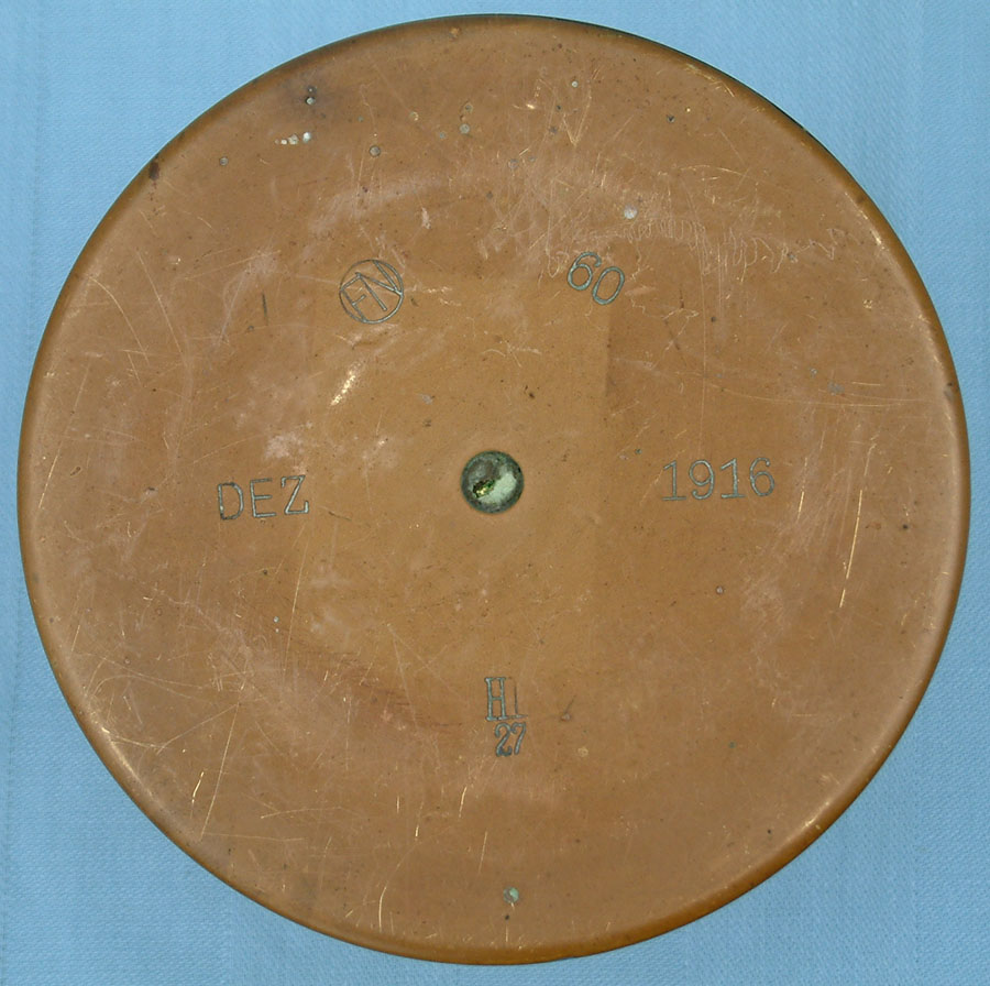 | A close-up of the head stamping on the base with the manufacturer's stamp and date. Marked: FN (Fritz Neumeyer cartridge factory) manufactured "DEZ 1916" (December 1916). "60" is the lot number of that batch of cases which were made during 1916. Hb27 is the control/inspection mark of the manufacturer Fritz Neumeyer. |