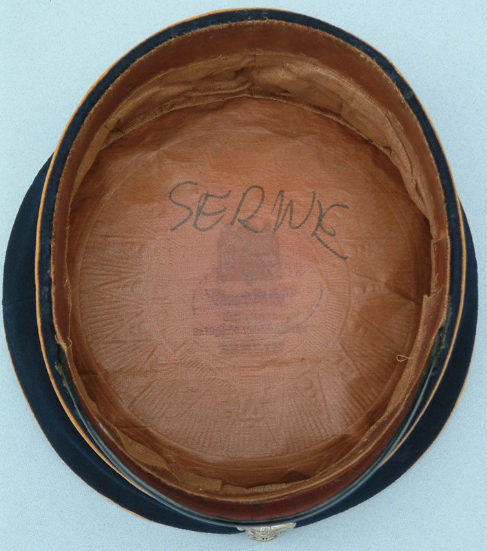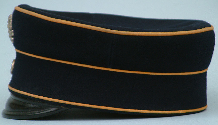 | A side profile showing the tiny front Vulcanfibre brim and thick piping, typcial for an early Schirmmütze | ||