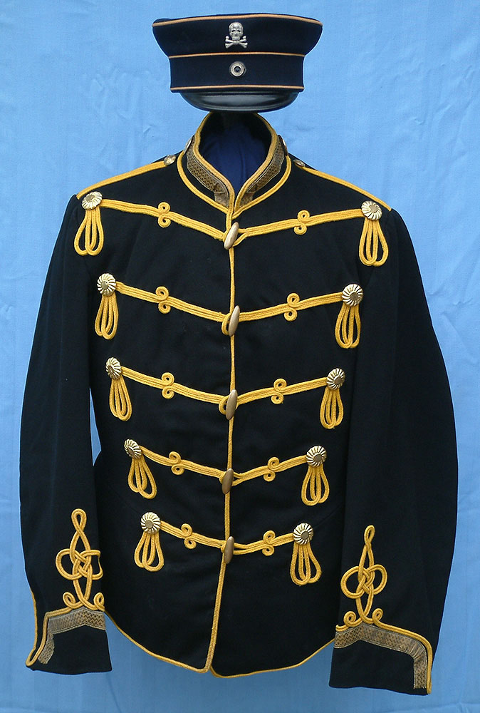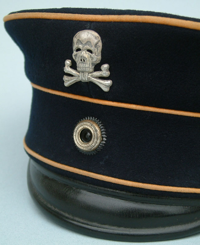 | Eigentumsstück (private purchase) Schirmmütze (visor cap) from Braunschweigisches Husaren-Regt. Nr.17 for an Unteroffizier mit Portepee (senior NCO with the Officer's sword knot). The all black Schirmmütze with yellow piping was only worn by Husaren-Regt. Nr.17 Unteroffizier mit Portepee until 1886. The Regiment received the Totenkopf in 1883, and received the red band in 1886 which dates the cap to three years; 1883 to 1886. | ||