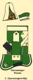 The Chevaulegers (Mounted Rifles) This page lists all Chevaulegers Regiments of the kingdom of Bayern (Bavaria). Although the cut was similar to an Ulanka, the Chevaulegers uniform was called a Waffenrock and carried Swedish cuffs. Like Bayern Ulanka, the Chevaulegers Waffenrock was only piped on the front opening; not on the false side of the double breast. It was Stahlgrun (dark steel-green) with the collar, cuffs, shoulder straps, and piping in the regimental color. Men wore cloth shoulder straps while officer's wore boards or epaulettes. Numbers or cyphers were not used. All Regiments wore a Bayern cavalry pattern leather Pickelhaube with silver or gilt fittings. The chart below lists the regiment and garrison, collar, cuff, and piping color, and details of the helmet Wappen (front plate). A color plate for Bayern cavalry is provided in a link at the top of this page which will open in a new window. |  | |
