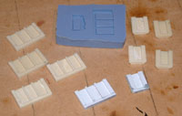 Making the Air Vent Housings I discovered that the superb photo-etched stairs made by my friend Peter Lienau were the same width as the air vents so I made one good housing for the side and a corner in plastic as a master and then made a mould. Once done, I cast the numbers I needed from resin. This photo shows the master, the mould, and the resin castings.