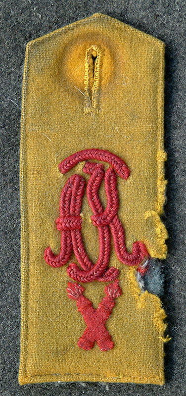 Shown here is a vey scarce (but slightly rodent munched) Model 1915 Bluse Mannschaften (Other Ranks) shoulder strap for soldiers from the Artillerie Prüfungs-Kommission in the 2. Garde-Fußartillerie -Regt. | |