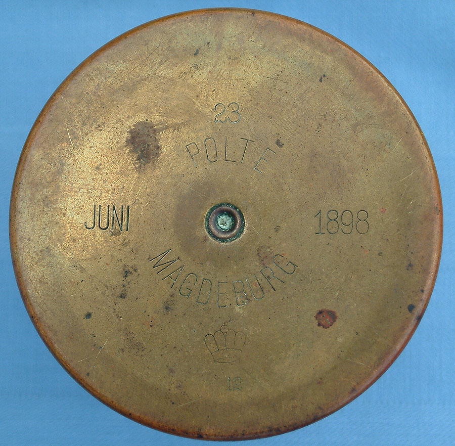 | A close-up of the head stamping on the base. Marked: POLTE MAGDEBURG (cartridge factory) manufactured "JUNI 1898" (June 1898). "23" is the lot number of that batch of cases which were made during 1898. The crown + "12" is the control/inspection mark at that time for the manufacturer Patronenfabrik Polte Magdeburg. | ||
