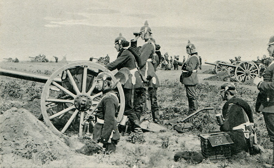 | A commercial postcard with a rare view of a 7,7cm cartridge casing for the Krupp leichte Feld Kanone (l.F.K. = light field cannon) being readied for loading by the kneeling Kanonier (Gunner). These cannons are immediately recognizable as 7,7cm l.F.K. 96 a/A as the barrels are slightly flared and there are seats for two crew with no shield. It appears that the officers with the crew are Army observers as they are wearing spiked Pickelhauben. | ||