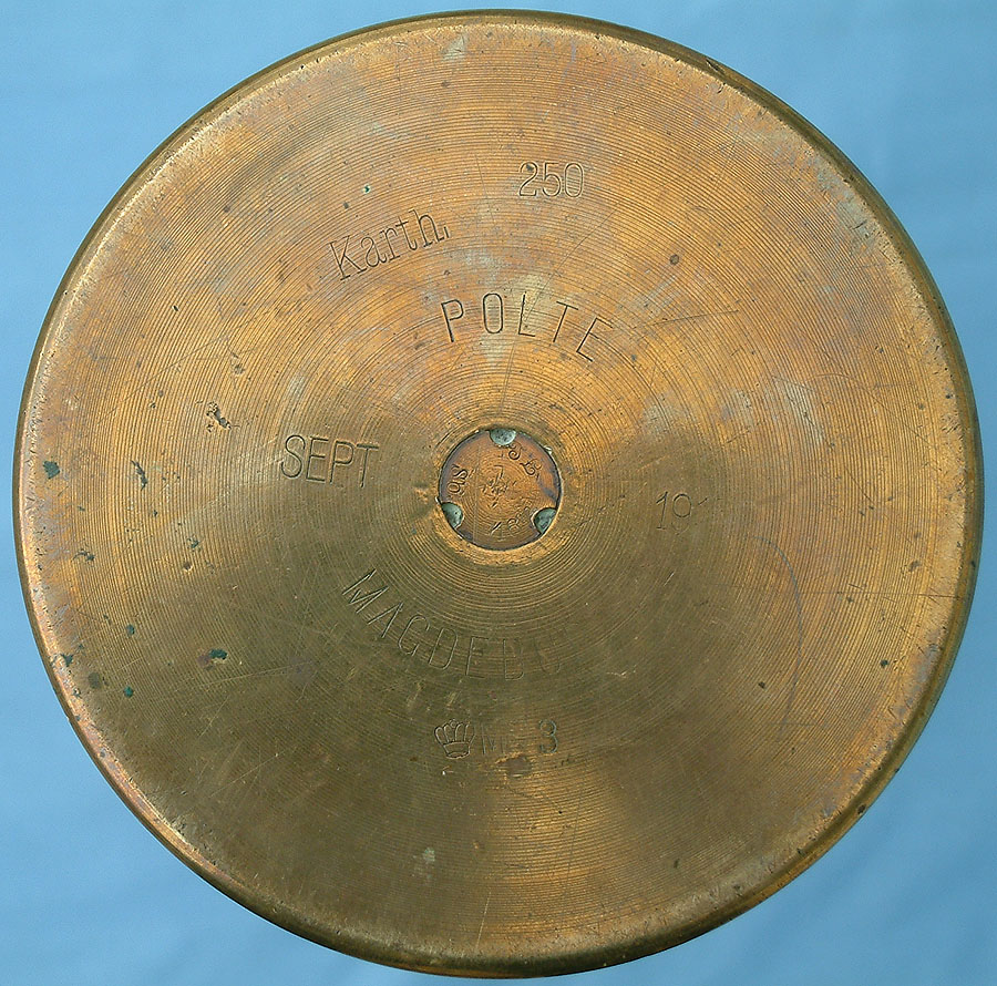 | A close-up of the head stamping on the base. Marked: POLTE MAGDEBURG (cartridge factory) manufactured "SEPT 1915" (September 1915). "250" is the lot number of that batch of cases which were made during 1915. The crown MC3 is the control/inspection mark of the manufacturer Patronenfabrik Polte Magdeburg. "Karth" is an unusual marking which is short for "Kartusche" meaning cartridge (- casing). | ||