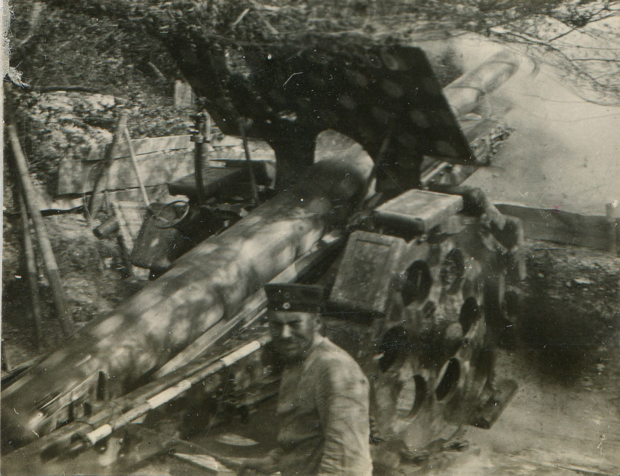 | A superb photo of a 13cm K 09 being loaded with this cartridge casing. Typical for all cannons over 10cm, it utilized separate ammunition where after the projectile was rammed home, a brass cartridge casing containing a set amount of propellant and the primer was inserted. The Gunner in the photo is loading the final piece: the cartridge casing. Note the "run-back ramps" behind the wheels which allowed the cannon to run-back on recoil and then roll back into position. | ||