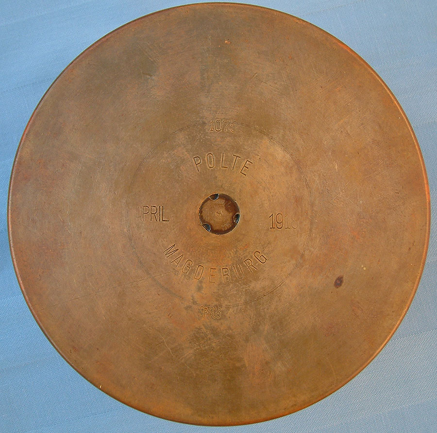 | 15cm cartridge casing for the Krupp 15cm s.F.H. (Schweres Feld Haubitze = heavy field howitzer) Model 02/13/13 Lang. To illustrate the size, the casing is photographed with an original issued Preußen M1910 Artillerie Krätzchen (field cap) which would have been worn by all Mannschaften (Other Ranks) below Sgt firing this weapon. 15cm sFH 13 Cartridge Casing Data:
