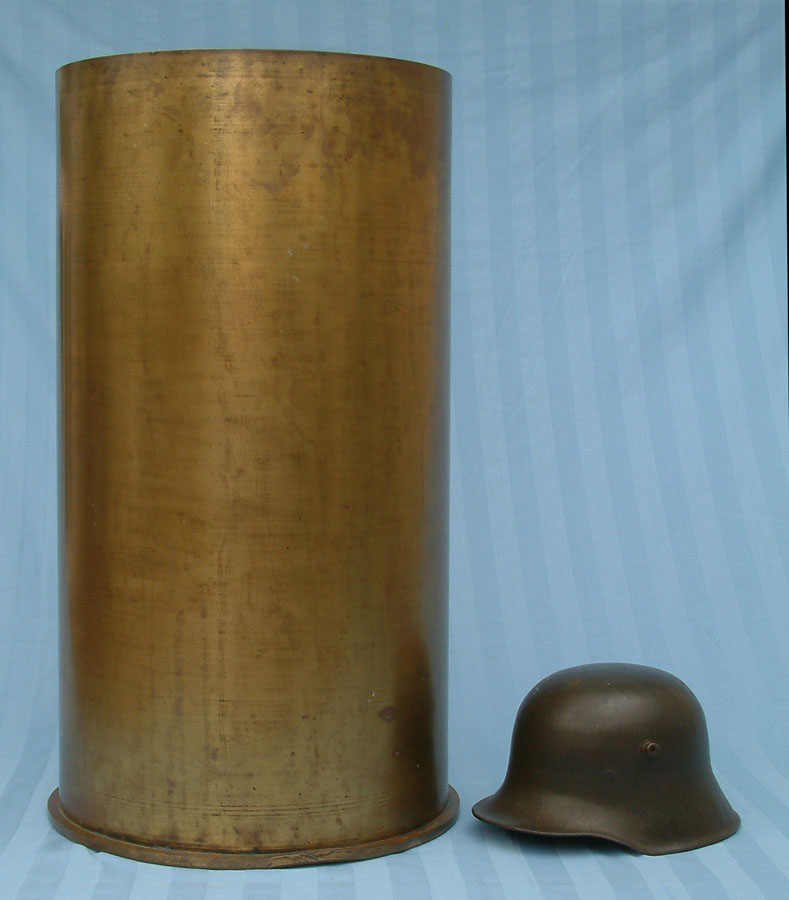 | 1916 dated 38cm cartridge casing for the Krupp 38 cm SK L/45 cannon. The 38 cm SK L/45 were Krupp naval cannons that armed the Kaiserliche-Marine (Imperial German Navy) battleships SMS Bayern and SMS Baden during the 1st World War. They were later mounted for land use and became the largest German cannon used on the Western Front; the legendary 38cm Max. The 38 cm SK L/45 Max. SK = Schnelladekanone (quick loading cannon) L = Länge (calibre X length of barrel i.e. L/45 = 38cm X 45 = 17.10 meters). To illustrate the size, the cartridge casing is photographed with a scarce original example of a Model 1918 Stahlhelm as would have been worn by Kaiserliche-Marine crew serving the Max in the last months of the war on the Western Front. 38 cm SK L/45 Max Cartridge Casing Data: