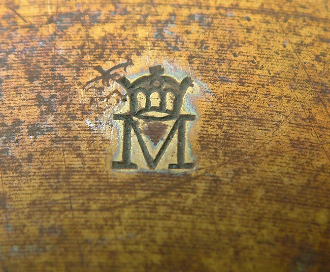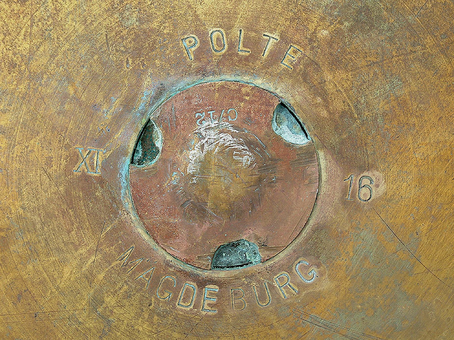 | A close up of the manufacturer's stamp and date. Marked: POLTE MAGDEBURG (cartridge factory) manufactured "XI 1916" (November 1916). Marine cartridge casings used Roman numerals for the month, while the Army used an abbreviation of the month. The "XI" in this case stands for November. Note that the primer has not been fired. | ||||||||||||||||||||||||||||