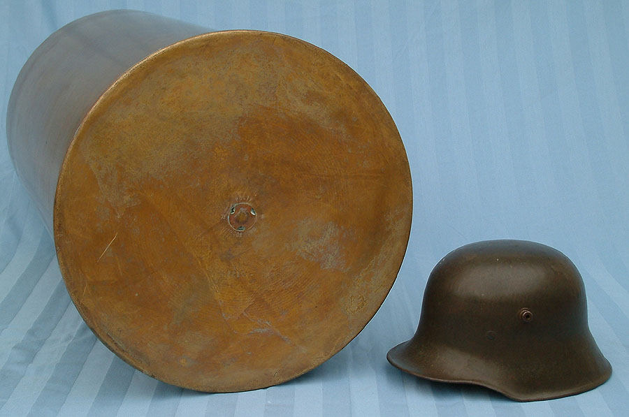 | The massive 465mm (18.30 inches) base of this 38cm cartridge casing shown with an original period Model 1918 Stahlhelm worn by Kaiserliche-Marine crew serving the Max in the last months of the war on the Western Front. | ||||||||||||||||||||||||||||