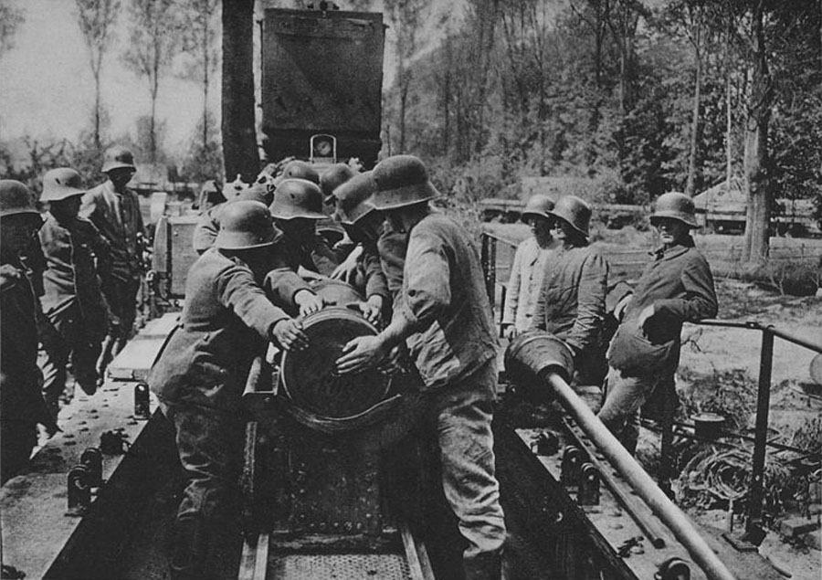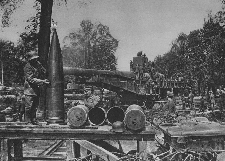 | ![]() An Marine Unteroffiziere (Petty-Officer) checks the specification of projectiles while (no doubt) the shortest Kanonier in the Marine unit poses with a 743 kg (1,640 lbs) High Explosive 38 cm SK L/45 projectile conveniently standing upright. | Eight 38 cm SK L/45 Max were built. Only the Army's Sächsische Batterie 1015 (Saxon Fußartillerie Battery 1015) is believed to have manned a 38cm SK L/45 Max. The remaining seven 38cm Max were manned by sailors of the German Kaiserliche-Marine (Imperial Navy). These units were originally called Marine-Sonderkommandos. They came predominantly from the II. Matrosen artillery Abteilung ( II.M.A.A. ) from Kiel Naval Base. So in these period photos, you are looking at sailors manning the cannons; not soldiers. ![]() Along the outer ring was a circular track to move the separate ammunition to the carriage which was pushed by hand on railway carts at no small effort to push 743 kg (1,640 lbs) of High Explosive. As the projectile and charges were being man-handled to the hoist, the cannon was being lowered to 0 degrees elevation for loading. | Note the tall sailor on the left leaning on the rail. He is visible is several photos in the same comfortable position. ![]() With the barrel and breech at level, the loading crew inserted the 743 kg (1,640 lbs) projectile into the breech, then rammed it home with a large leather plunger on a wooden pole (visible on the right) so the copper driving bands on the projectile would bite into the barrel rifling and hold it in place, even after the barrel was elevated. Approximately eight men (counting helmets in the photo) were required to ram the shell home. This was followed by a large high explosive charge in a silk bag and then finally the brass cartridge casing which held the initial charge. Then the breech was closed. | Once again the tall sailor is leaning on the rail on the right. But not for long.... ![]() Now it was time to get the hell off! | You can see the crew scrambling to get off the Max as the carriage is traversed in azimuth by the boys at the bottom mount.