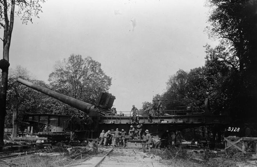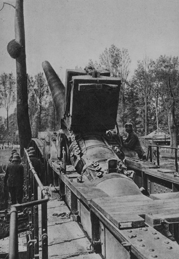 38 cm SK L/45 Max | ![]() When work ceased on SMS Sachsen, and SMS Württemberg the two ship's 38 cm SK L/45 cannons were released as badly needed long-range heavy artillery on the Western Front. The 38 cm SK L/45 Max were transported and mounted in an Eisenbahn und Bettungsgerüst - (E. u. B. = railroad and firing platform) system which was designed to increase the cannon's mobility. One requirement for the Eisenbahn und Bettungsgerüst system was the mounting of a large counterweight just forward of the trunnions that folded for traveling to counteract the weight of the massive breech. Eight 38 cm SK L/45 are believed to have been built, with several being emplaced in the Pommern and Deutschland coastal defense batteries on the Flanders coast.