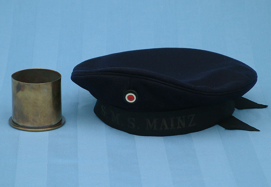 | 6,0cm cartridge casing for the Krupp C/98 Kaiserliche-Marine (Imperial German Navy) Landing Cannon. To illustrate the size, the casing is photographed with an original Kaiserliche-Marine Mutze from SMS. Mainz. The SMS Mainz was a Kaiserliche-Marine light cruiser of the Kolberg class. She was launched in 1909 and armed with twelve 10.5 cm guns with a top speed of 27 knots. Within weeks of the outbreak of World War I, she was sunk along with her sistership Köln and the light cruiser Ariadne, in the first Battle of Heligoland Bight on 28 August 1914. 89 of the crew remain on board. 6,0cm C/98 Marine Landing Cannon Cartridge Casing Data: