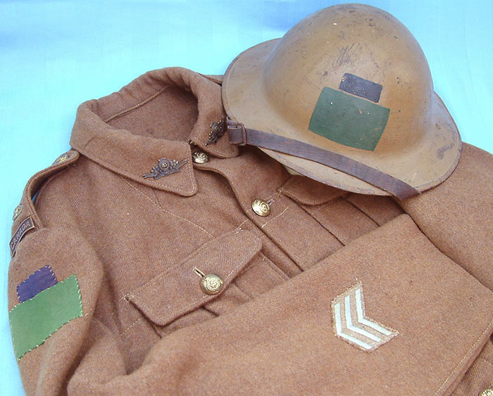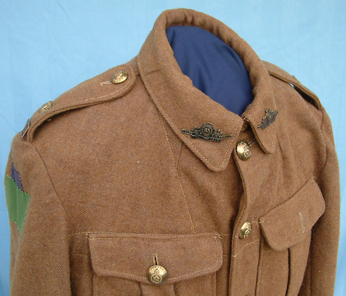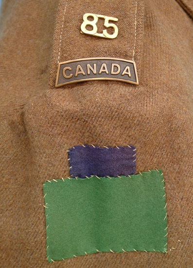 | The shoulder displays a 85th Bn 4th Canadian Division formation patch on each shoulder. The distinctive 85th Bn collar badges are darkened brass. |