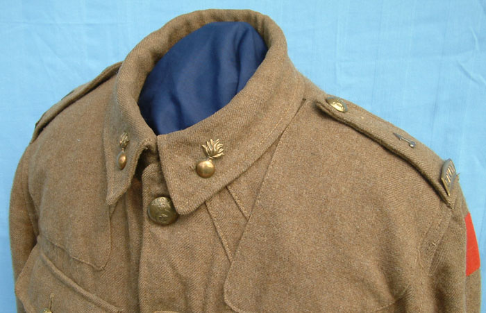 | A view of the red wool 1st Canadian Division formation patch sewn to each each shoulder and the unique addition by Sapper Pearson of a metal No 1 on each shoulder strap from a German Officer's shoulder board. Collars are the stamped brass flaming bombs which were also used by artillery. | ||