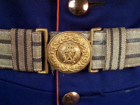 | The Preußen Officer's Brocade belt is manufactured from woven silver bullion, with two black interwoven stripes signifying the state. The buckle is highly detailed stamped gilded brass with the "WII" cypher of Kaiser Wilhelm II. The belt is backed in a light blue cloth. |