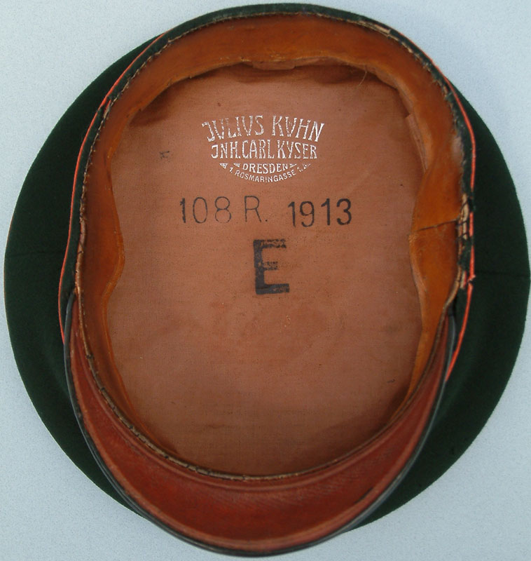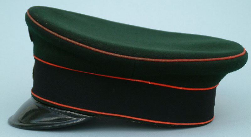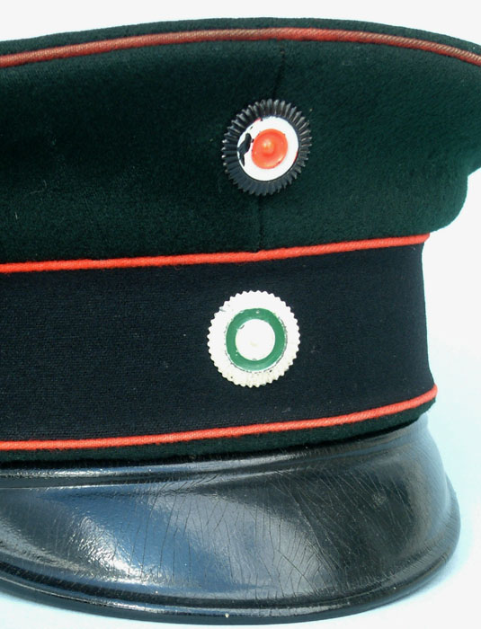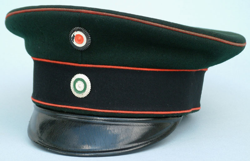 | Sachsen (Saxon) NCO Schirmmütze from Kgl. Sächs. Schützen (Füsilier)-Regiment Prinz Georg Nr.108, Dresden, XII Armee Korps. This very nice quality Schirmmütze is made from a high quality Dunkelgrün (dark green) doeskin wool with Ponceaurot (poppy red) piping. The Sachsen Dunkelgrün was darker than Preußen Jäger, looking almost green/black. | ||