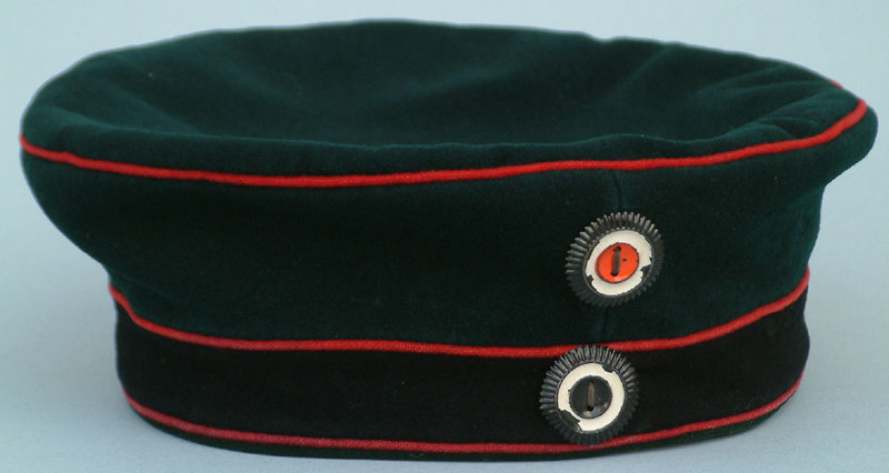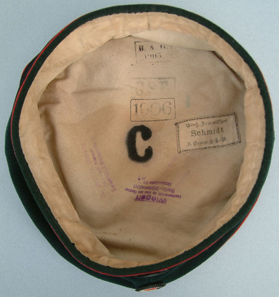 | Mannschaften (Other Ranks) issued Krätzchen (cap) from Preußen Garde-Schützen-Batl. (Berlin) Garde-Korps. This example is in excellent condition for being issued in 1905; there is no moth tracking or damage of any kind, a testament to the durability of the high quality wool used on issued clothing. The Garde-Schützen-Batl. was only a battalion in size, which combined with the almost complete devastation of Berlin in WWII, make any clothing items from the Garde-Schützen-Batl quite rare. | ||