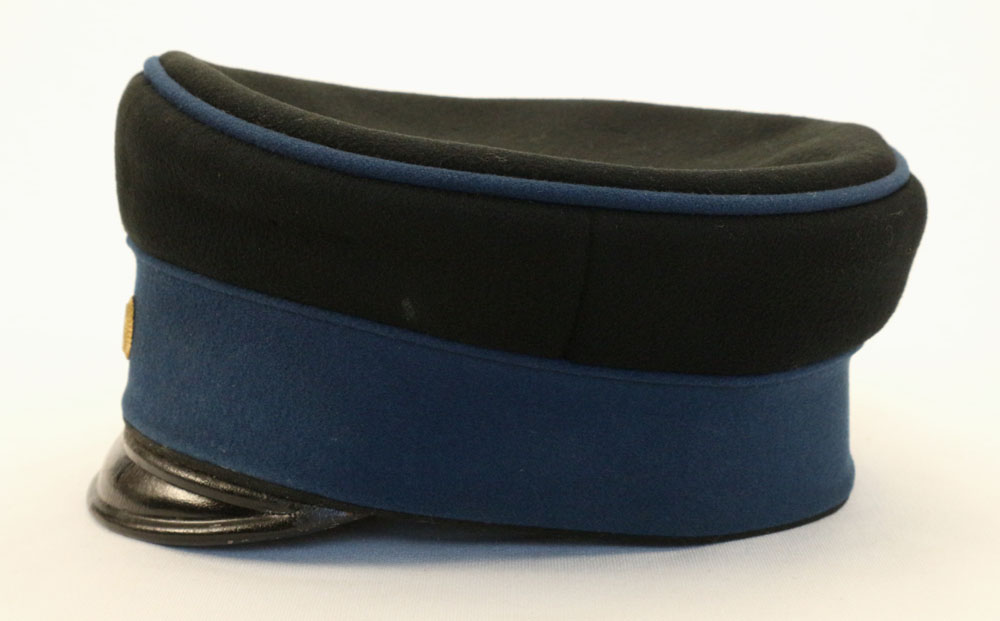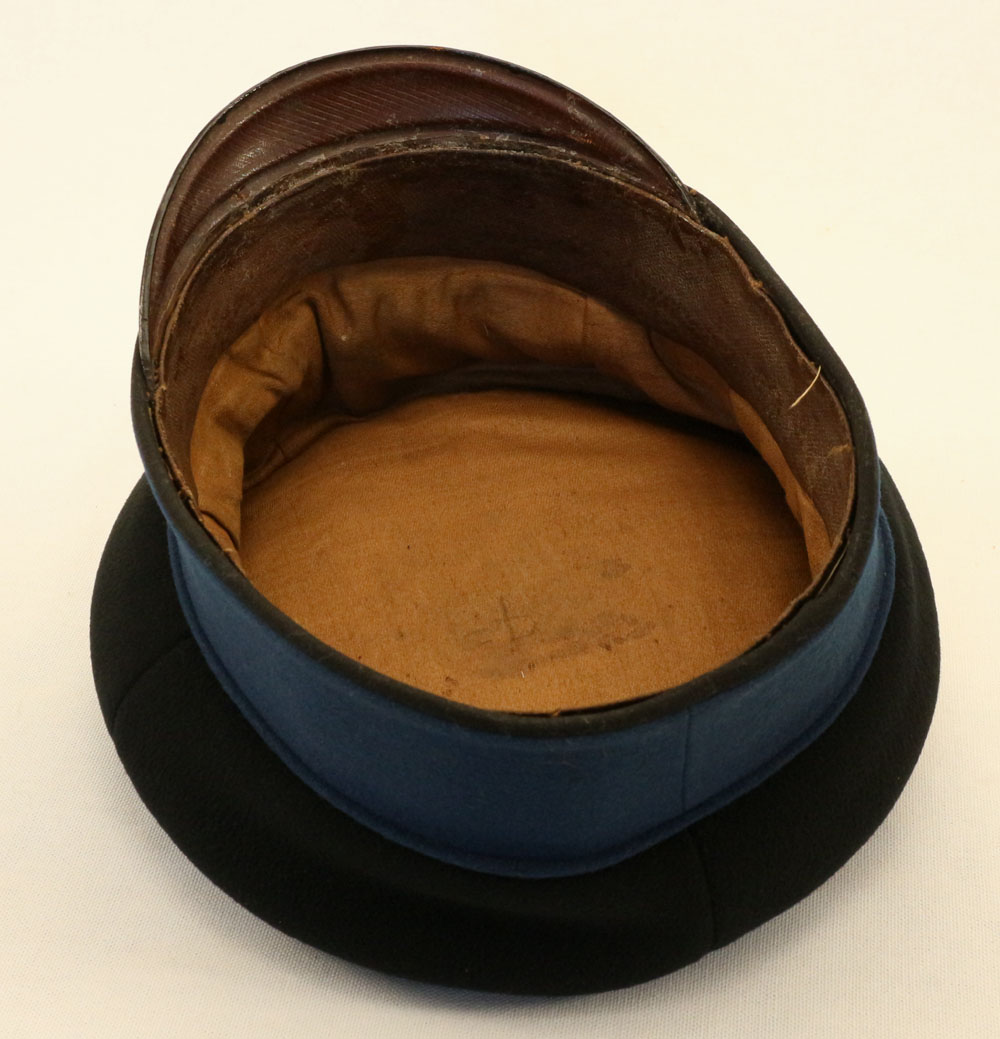 | The Braunschweig NCO Schirmmütze is highly distinctive, being made with a black wool top with cornflower blue band and piping. The flat Teller (plate) shape and the small visor is typical of Schirmmützen from the 1800s. This Schirmmütze was probably manufactured in the 1870s as it has the fat piping and vertical body shape with no overhang, as is typical of that period. |