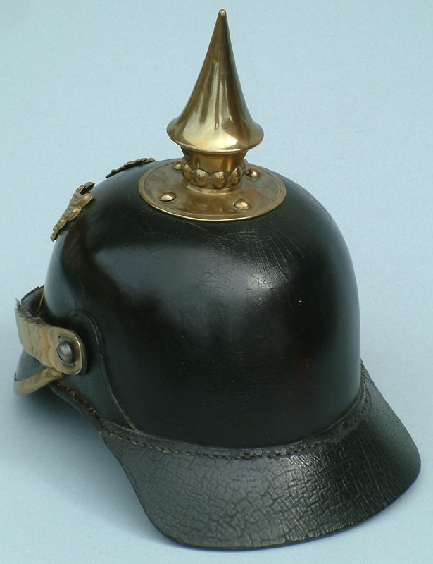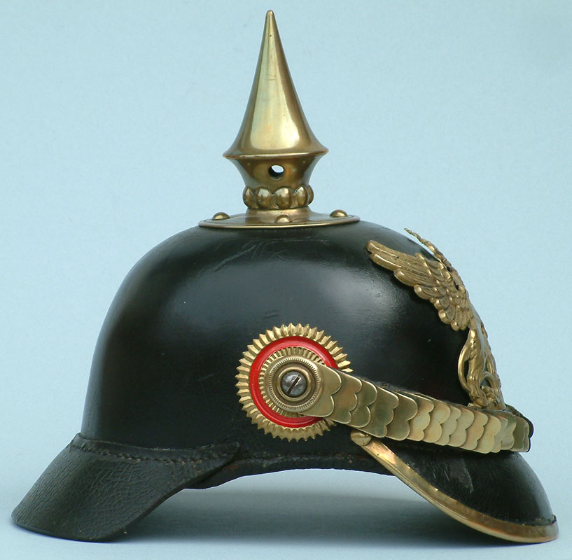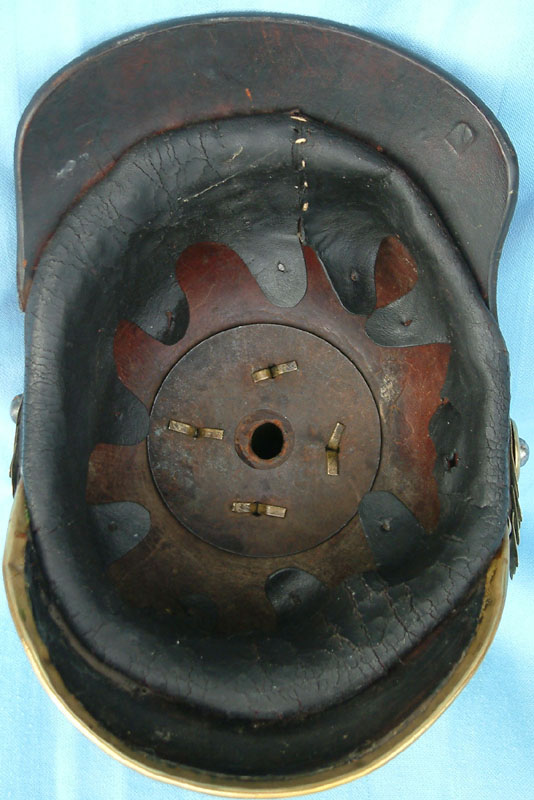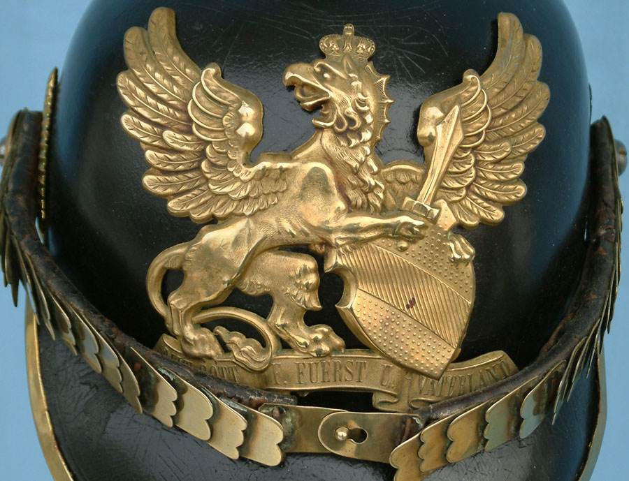 Model 1867 Baden Infantry Mannschaften (Other Ranks) Pickelhaube. This helmet is typical of those worn by some of the contingents in the Franco-Preußen war. Like a typical M1867 helmet, is has no rear spine as per the M1867 regulations, but unlike a Preußen M1867 which had a unique slider to retain the Wappen (front plate) Baden did not adopt this system and utilized the standard threaded screw posts.