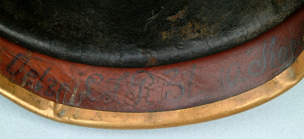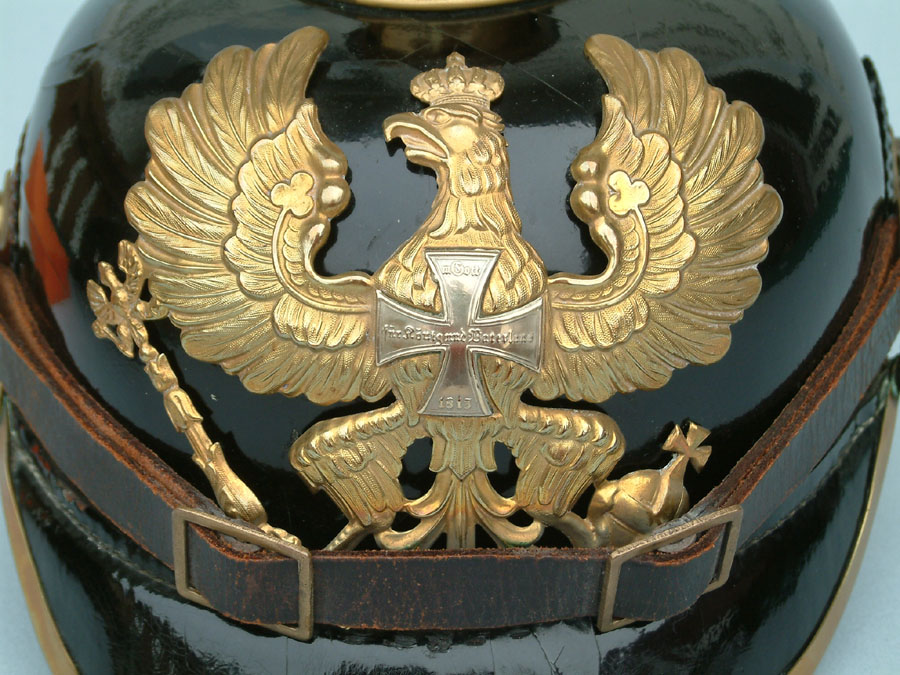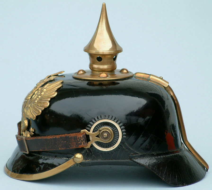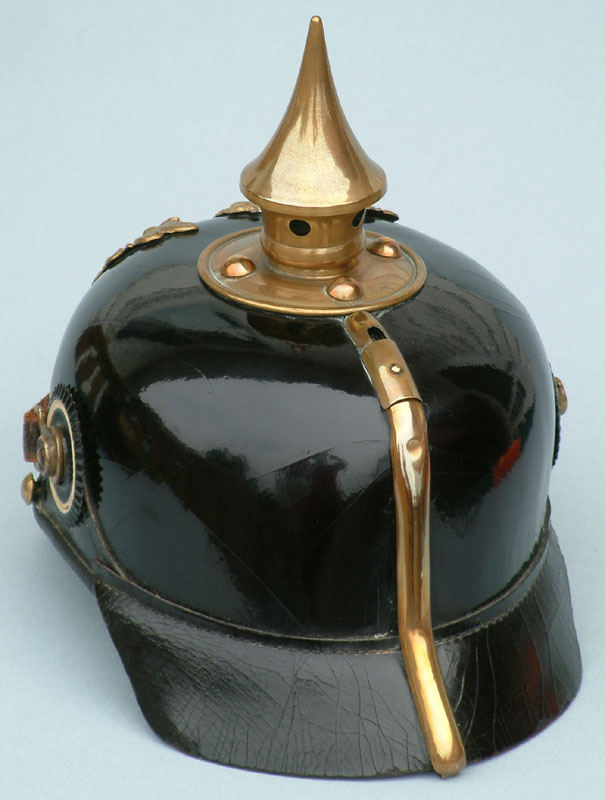 | A side view showing the classic squared shape of the M1895 pattern Pickelhaube. | ||