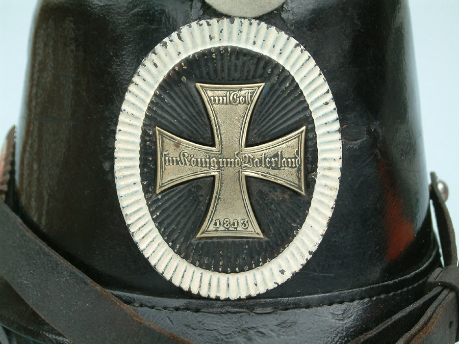 | A view of the Preußen Landwehr Mannschaften Tschako Wappen (front plate) worn by the Landsturm in 1914. As is typical for these old Tschakos converted for Landsturm use, the wider holes where the Preußen eagle Wappen was mounted have been filled with leather and new slots cut into the front to accommodate the Landsturm Wappen. The Wappen is secured to the Tschako with twin loops with leather wedges, similar to the M1895 Wappens. | ||