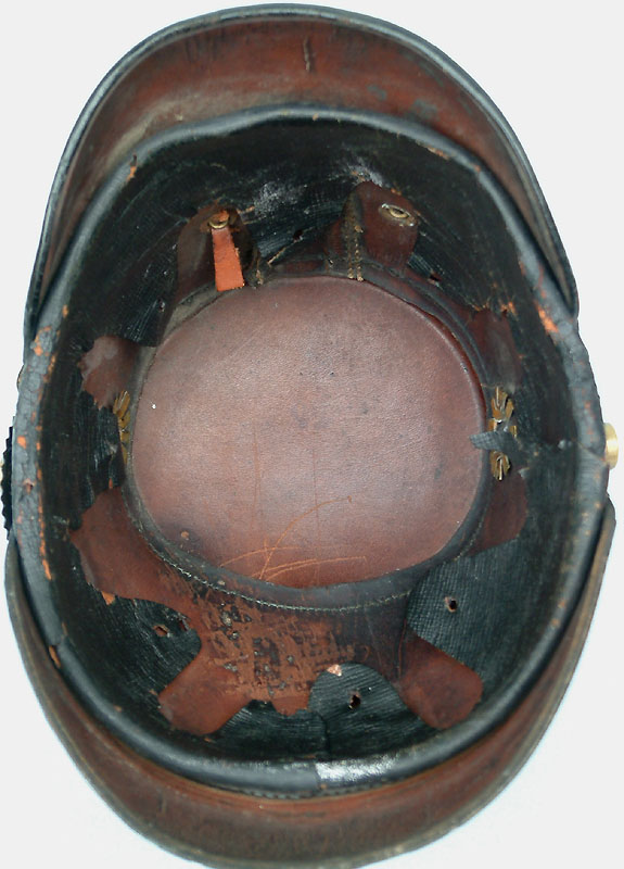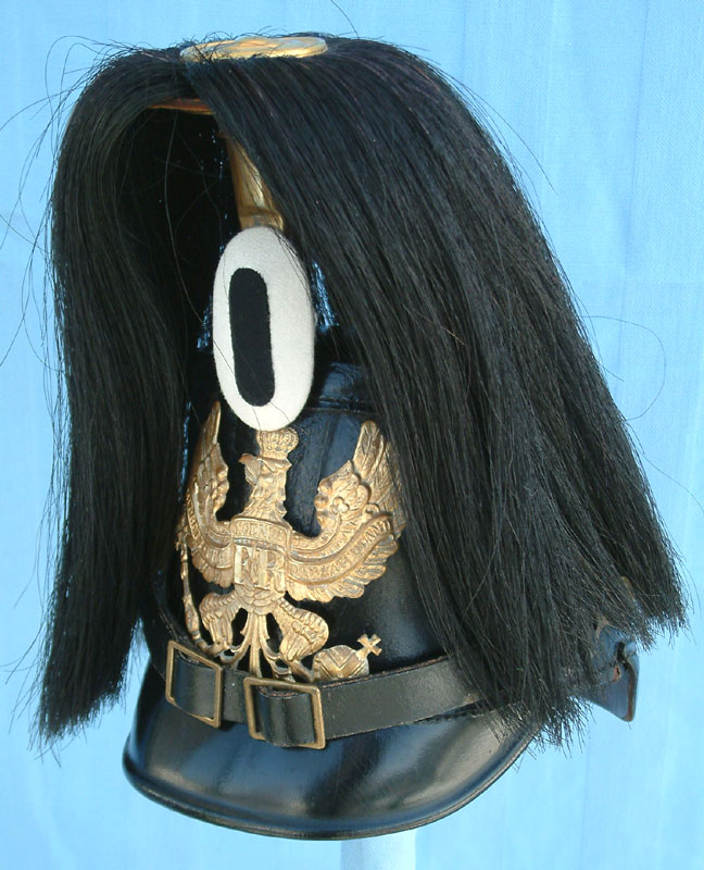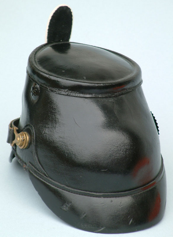 | A side view showing the classic squared domed rear skull of the 1895 Preußen Jäger Tschako. | ||