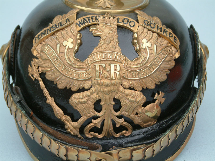 | A view of the Hannover FAR10 Officer's Wappen (front plate). Note the voided crown and sharp detail. On Officer's titled helmet plates the "Bandeau" is a separate piece that is soldered onto the helmet plate itself. On enlisted helmets, the Bandeau is part of the plate stamping. | ||
