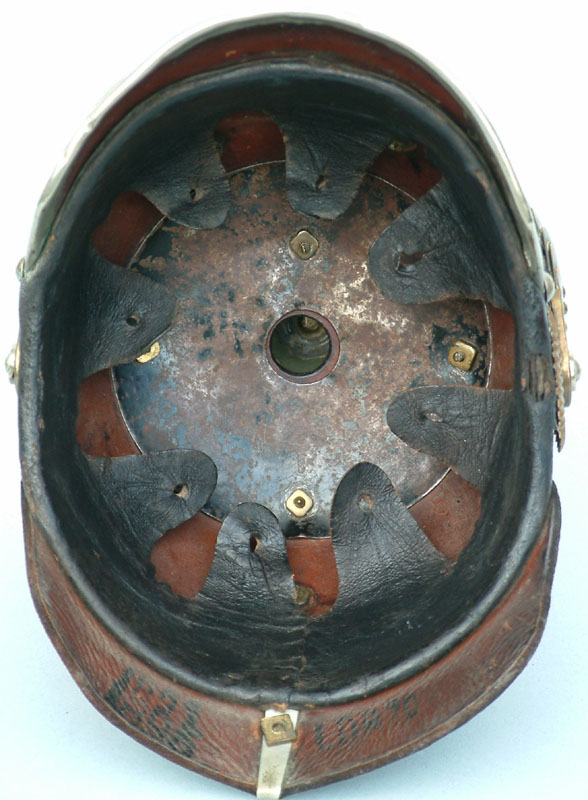 | All issued Dragoner helmets have the rear spine secured to the helmet shell by two external brass or silver studs. | |