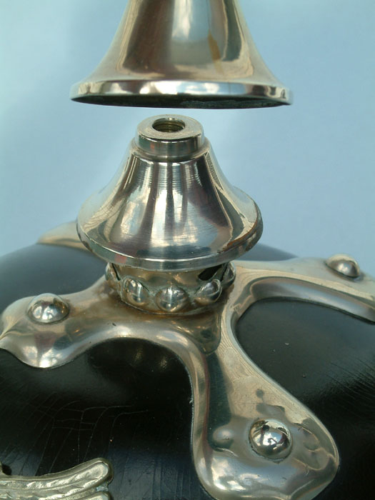 As is typical for a Dragoner Pickelhaube, the front visor is square, the spike base is cruciform, the rear spine of the helmet is secured to the helmet shell by two external silver studs, and there is a silver Perlring around the spike neck. These features are found on all Dragoner Mannschaften and NCO Pickelhauben right up to and including the Model 1915. |  | |