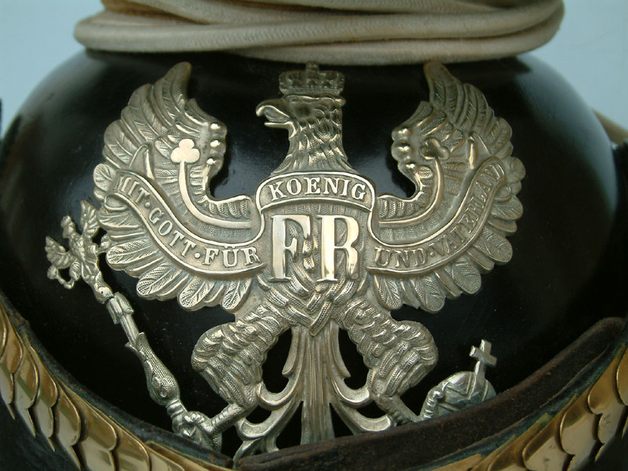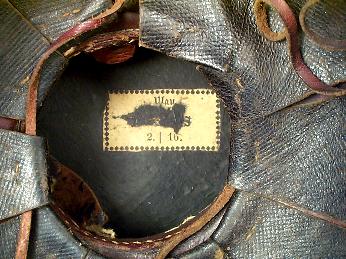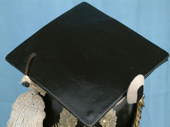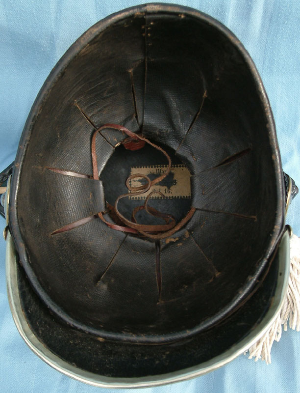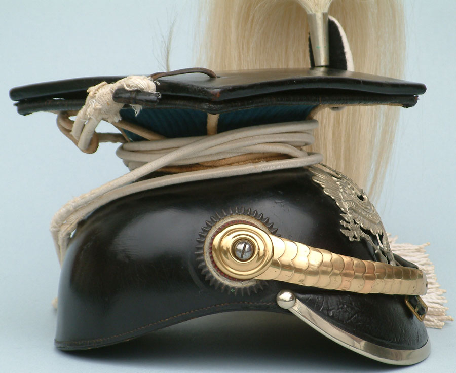 | A side view of the Model 1867 Tschapka. Note how the back of the helmet is designed so that it curves down around the wearer's skull. The cloth "Rabbate" around the neck is blue trimmed in white which are the Regimental colors for UR16. | ||
