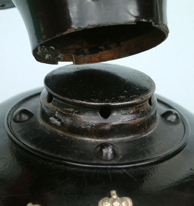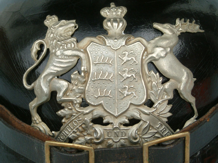 | A view of the Württemberg Ulanen issued Wappen (front plate). Like its Preußen counterpart, the small Württemberg Ulanen Wappen measures only 95mm from the top of the crown to the bottom of the center, compared to the larger Infantry Line Wappen at 125mm | ||