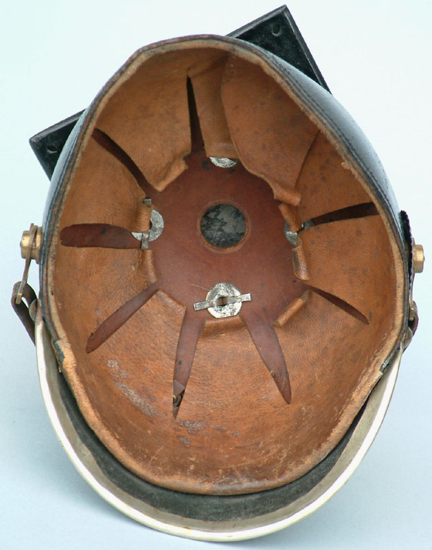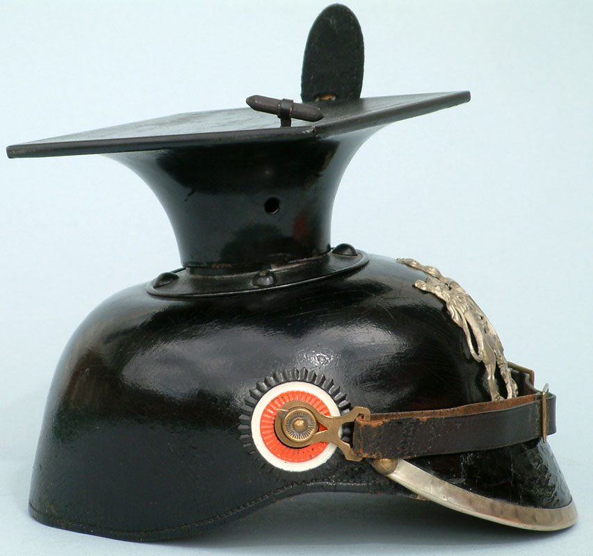 | A side view of the Model 1915 Tschapka. Note how the back of the helmet is designed so that it curves down around the wearer's skull. | ||