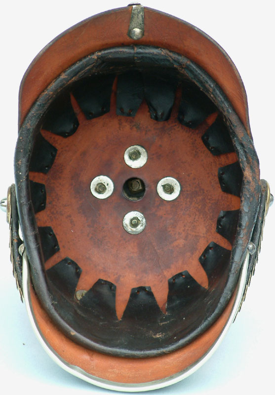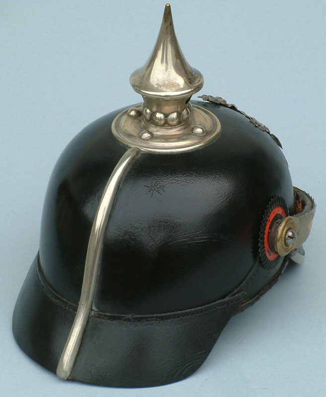 | A side view of the helmet showing the Model 1871 screw post retainers for the flat brass chinscales. Note that as this is a pre 1897 helmet, no Reichs-Kokarde is worn. Note the pre-1887 Perlring as worn by all non-officer ranks and the plain rear spine. | ![]() |