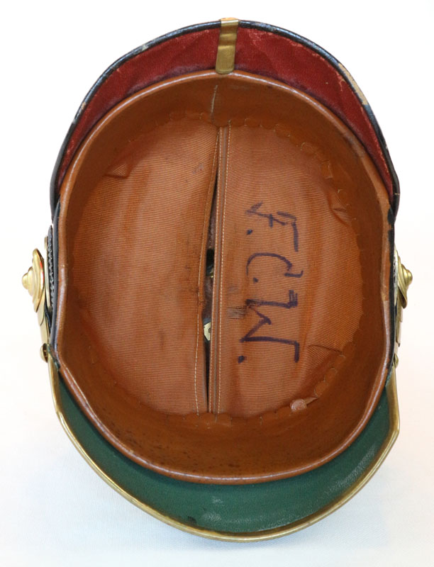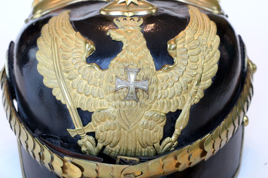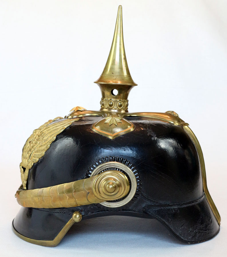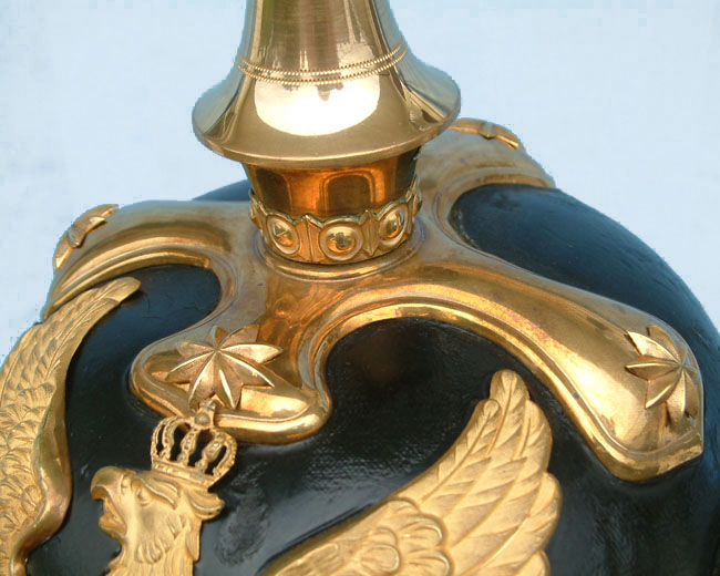 | A view of the Preußen Landwehr Officer's Dragoner Regt Pickelhaube profile. All Dragoner Regiments were allowed to wear a Haarbusch (parade plume). To accommodate a Haarbusch, the tall spike top is removable. | ||