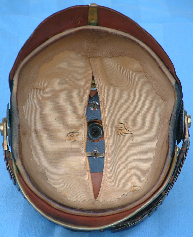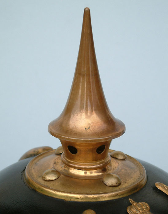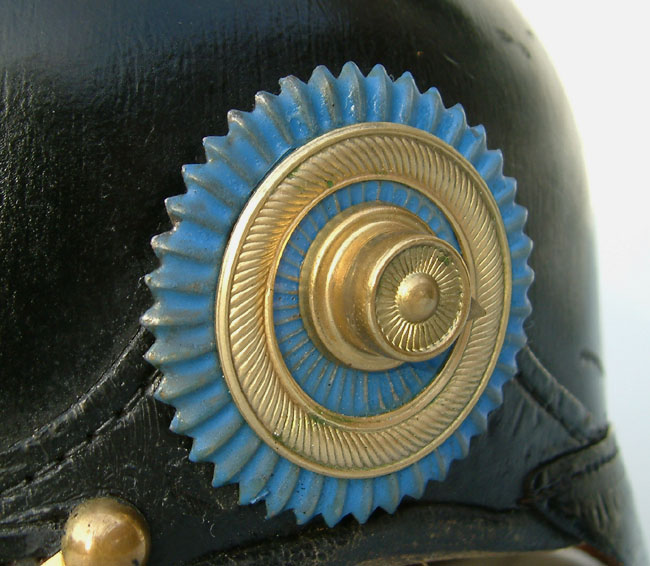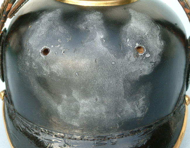 This is important, as if there was doubt about the Wappen being original to the helmet, with a removable spike top it would limit the helmet as being from one of the regiments that wore a Preußen Grenadier eagle Wappen or those with a with a smaller State Wappen overlaid on the eagle who were entitled to wear a Haarbusche. Only Grenadier Regts 2 to 9 (with the old Grenadier Wappen), and the other Regts with equally rare Wappen, like IR 91, 93, 94, 95, 96, and 153 would qualify. | |