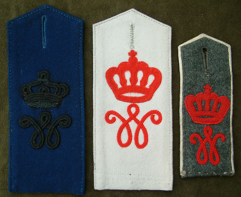 On the left, the dark blue pattern with black cypher worn on the Braunschweig Polrock (which looked like a Husaren Attila) until 1886 with cord cypher, in the centre the white strap with red chain-stitched and felt cypher cypher worn after Braunschweig adopted the Preußen pattern Waffenrock in 1886, and on the right the M1915 strap worn on the M1915 Bluse. | |