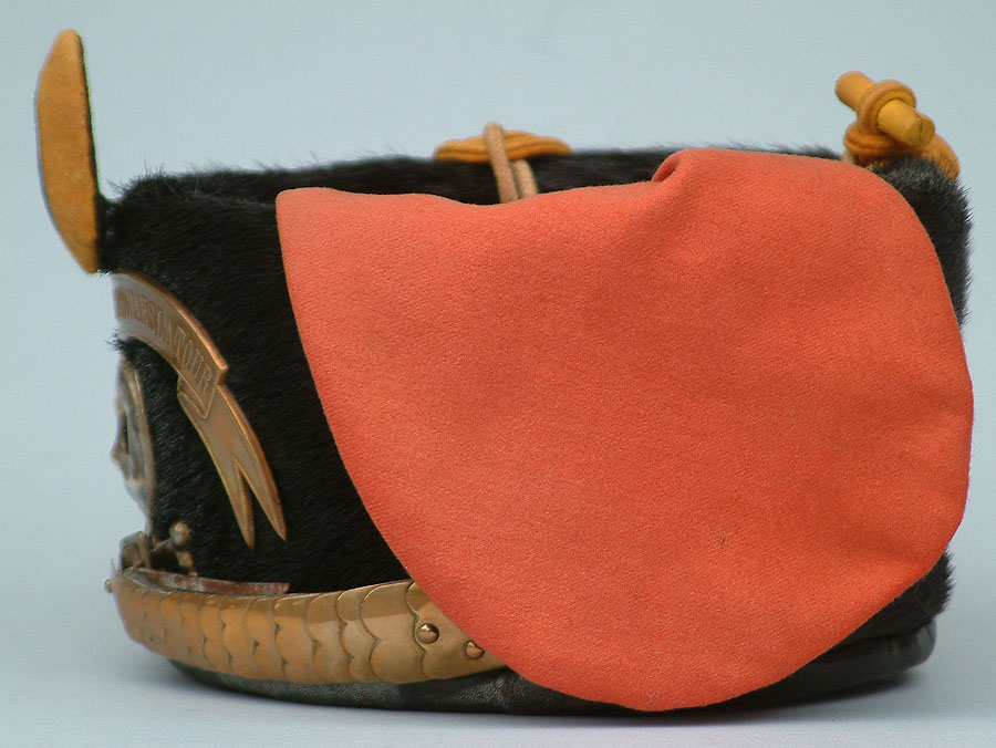 | A side view of the Pelzmütze. The ponceaurotem Kolpak (poppy-red bag) has faded on the exterior and is much brighter on the underside. The gilt chinscales are secured to the body on Model M91 brass posts. | ||
