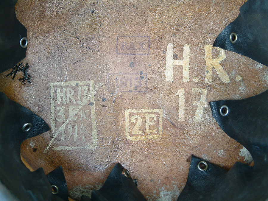 | A view of the issue markings inside the top. In a black ink square are "BAX" for the clothing depot of the X Armee Korps and "1913" the date the Pelzmütze body was accepted into inventory. It was issued to "3 Esc" (3rd Squadron) in 1914, then moved over to the inventory of "2E" (2nd Squadron). | ||
