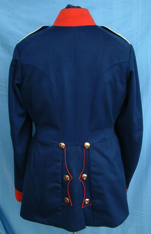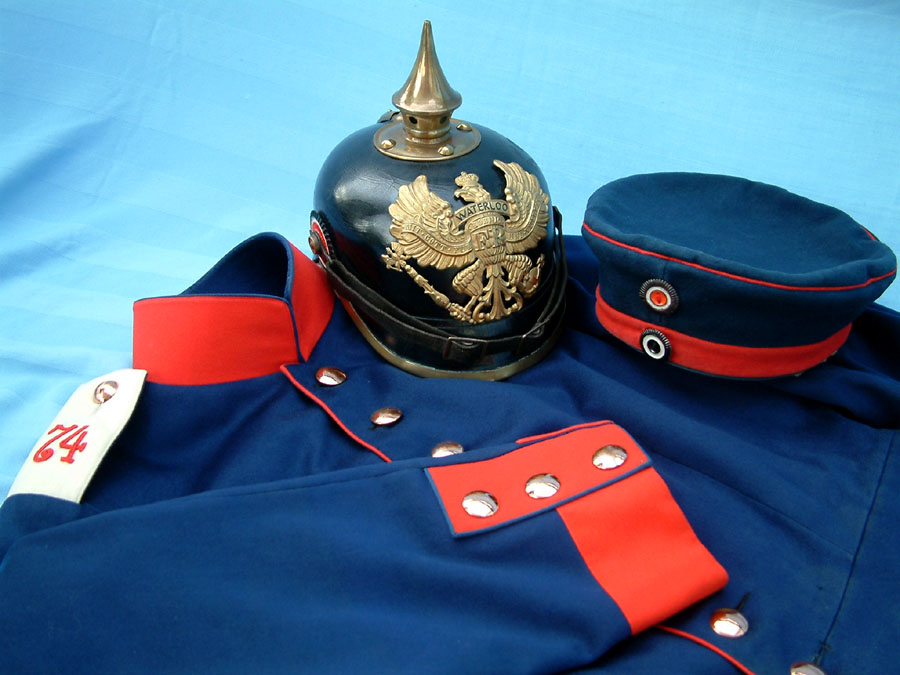| The Waffenrock with matching Krätzchen (cap) and Pickelhaube. The piping and band on the Krätzchen are in the infantry facing color of red, while the fittings on the Pickelhaube match the color of the buttons on the Waffenrock. To see the Pickelhaube click Here. To see the Krätzchen click Here. | ||