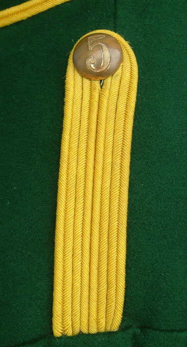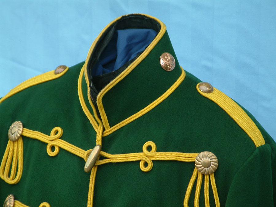The Attila is a high quality dark green doe-skin wool with bright yellow cord frogging (braiding), gilt toggle buttons and rosettes. The lining is black silk .