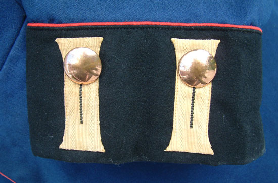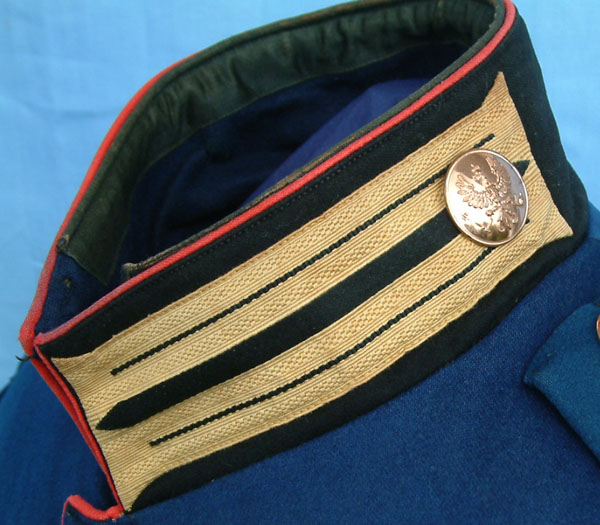 | A view of the collar and shoulder straps. The massive yellow cloth Garde Litzen on the collar are apparent in this photograph. The single rank button on the collar identifies the rank as a Gefreiter (Corporal). | ||