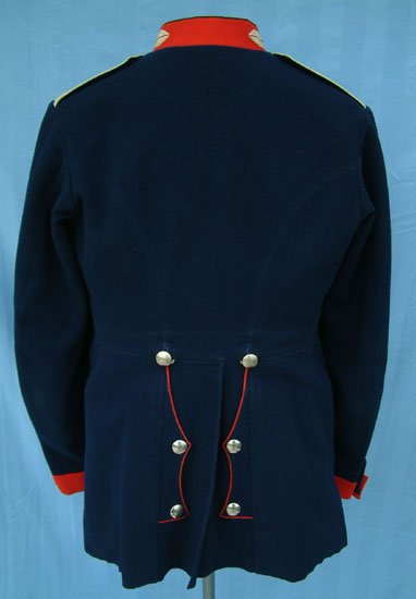 The vented rear skirt introduced in 1895 and the large buttons (used prior to 1895) identify this Waffenrock as being made shortly on or after 1895.