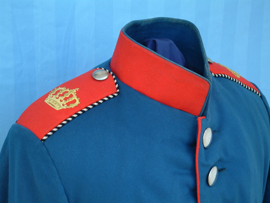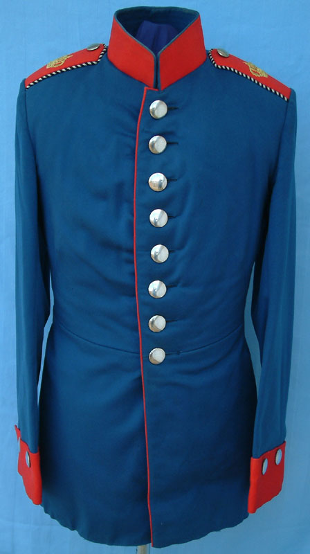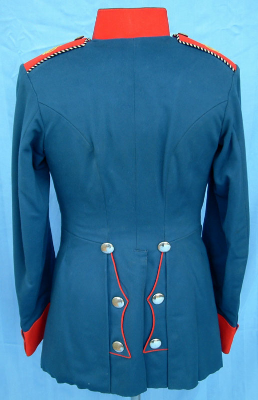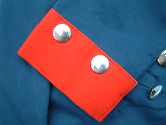 The facing color for DR Nr. 20 was red and is reflected by the red collar, cuffs, shoulder straps, and piping down the front pane and rear skirt.