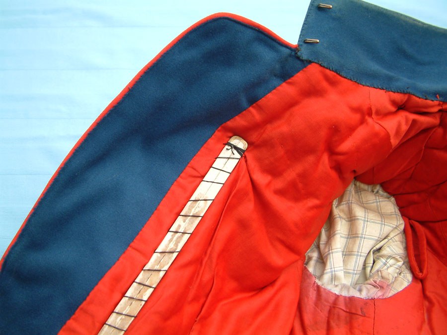 | The liner has a very unique feature; running vertically along the front opening on both sides is a metal strip covered in cloth, which keeps the front of the Waffenrock straight and stiff. Interestingly, it would have been difficult for the wearer to sit down comfortably while wearing this Waffenrock! |