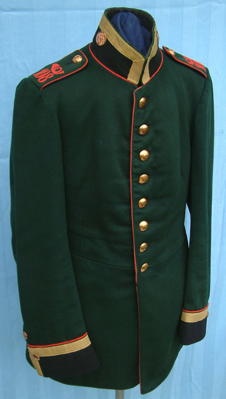 | A matching Waffenrock, Tschako, and Schirmmütze for a Sergeant in the Kgl. Sächs. Schützen (Füsilier)-Regiment Prinz Georg Nr.108, Dresden, XII Armee Korps. To see the Schirmmütze click Here. To see the Tschako click Here. |